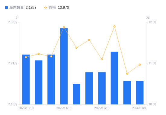 日期A股户数(户)流通A股户均持股数(股)户均持股市值(万元)2026-01-09218009694.1410.632025-12-31218009694.1410.422025-12-19228009268.9611.032025-12-10221009562.5510.612025-11-28221009562.5511.062025-11-20217009738.8211.082025-11-10236008954.7610.642025-10-31227009309.7910.402025-10-20225009392.5510.552025-10-10227009309.7910.38