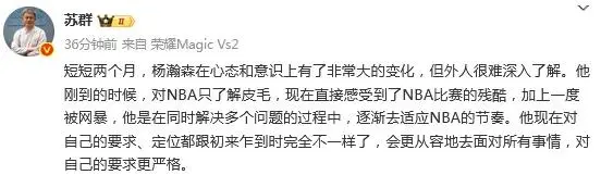 苏群表示:“短短两个月,杨瀚森在心态和意识上有了非常大的变化,但外人很难深入了解。他刚到的时候,对NBA只了解皮毛,现在直接感受到了NBA比赛的残酷,加上一度被网暴,他是在同时解决多个问题的过程中,逐渐去适应NBA的节奏。他现在对自己的要求、定位都跟初来乍到时完全不一样了,会更从容地去面对所有事情,对自己的要求更严格。